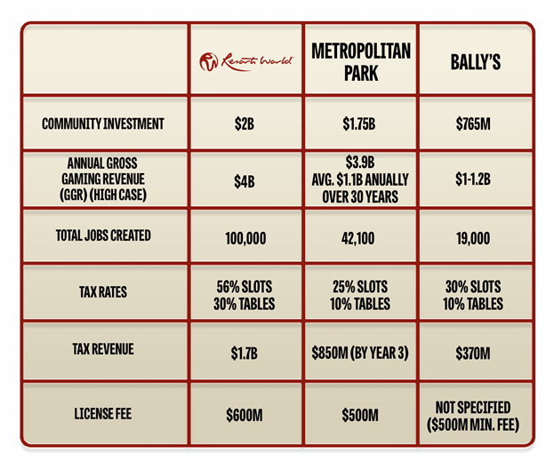 • Resorts World New York City is projected to deliver unmatched scale, the highest Gross Gaming Revenue, the highest casino taxes of any applicant – regardless of how many licenses are awarded and to what combination of the three remaining bidders – generating up to $4 billion by 2031 in the high-case scenario in which one casino license is awarded.