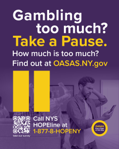 There are many gambling opportunities in New York State: Casinos, Lottery games, bingo, pari-mutuel wagering, sports betting and more. What most people don’t realize is that gambling behaviors can lead to significant negative consequences and become an addiction.