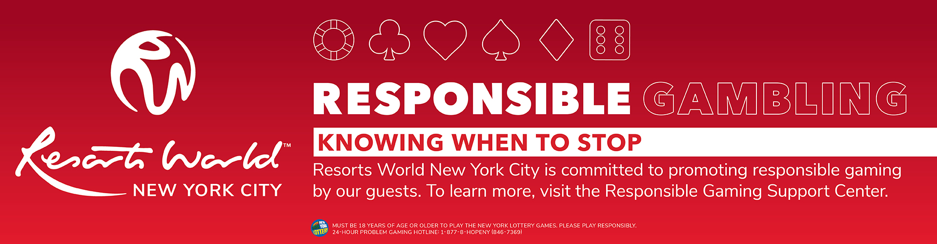Resorts World New York City is committed to encouraging responsible gaming for our guests. Our commitment to being socially responsible aligns with our efforts in protecting guests, while strictly enforcing the minimum legal wagering age established by law. We offer various responsible gaming resources and free assistance to our guests. Our focus and commitment remain true to the overall message to “PLAY RESPONSIBLY” in the state of New York.